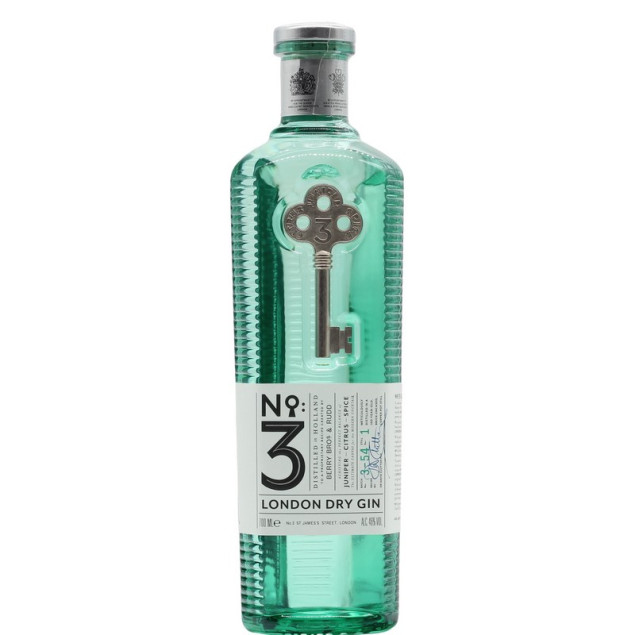 No. 3 London Dry Gin Rubrik: Gin Ursprungsland: England Nettofüllmenge:  0,7 Liter Alkoholgehalt: 46% vol. Zusatzstoffe: – Loskennzeichnung: ja Warnhinweise: Abgabe nicht an Jugendliche unter 18 Jahren Nicht für schwangere oder stillende Frauen empfohlen Name und Adresse des Herstellers / Importeurs: Berry Bro´s & Rudd, 3ST James´s Street London Beam Deutschland GmbH, Unterschweinstiege 2-14, 60549 Frankfurt am Main Zutaten: neutrale Getreidespirituose, entkalktes Wasser, Koriander, Wachholderbeere, süße Orangenschale, Engelwurz-Wurzel, Grapefruitschale, Kardamom Charakteristik: No. 3 London Dry Gin ist ein herausragender Gin aus dem Hause Berry Brothers. Auf der Flasche ist ist ein Schlüssel zu der St. James Street No. 3 in London eingearbeitet. Ob er da jetzt noch passt? Als Botanicals wurden Wacholderbeeren, Kiefernnadeln und Lavendel verwendet. Ein überaus zu empfehlender Gin.