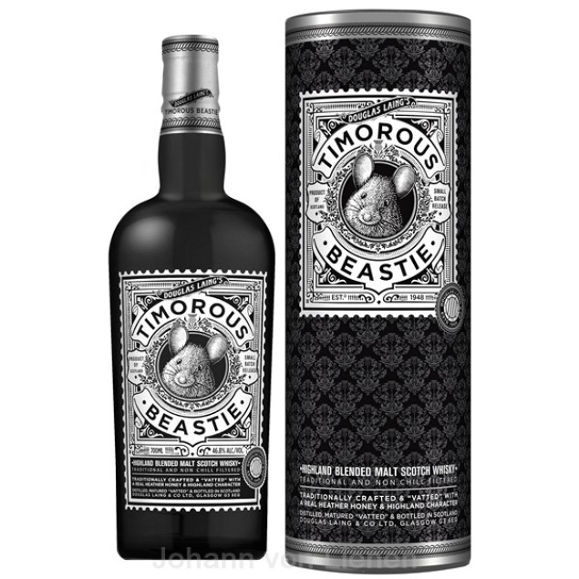 Timorous Beastie Timourous Beastie ist ein feiner, schottischer Blended Malt von warmer Bernsteinfarbe und mit einem speziellen, vielschichtigen Geschmacksbild. Bereits im Duft zeigt er sich komplex: Er ist süß und karamellig, duftet nach Honig, getrockneten Aprikosen, Erdbeeren und weißen Trauben, aber auch ein wenig nach Sherry. Dazu fügen sich einige leicht florale Nuancen. Im Geschmack ist Timourous Beastie besonders weich und fruchtig mit Noten von Trockenobst, grünen Äpfeln und süßlichem Anis, ein Hauch von Fudge und Rosinen mischt sich dazu. Das Finish ist lang und trocken mit feurig-süßem Zimt; etwas Menthol erinnert ein wenig an würzige Hustenbonbons, dazu gesellt sich die angenehm holzige Note von Eiche. Die schmale Flasche des Timorous Beastie ist aus braunem Glas und trägt ein großes, schwarz-weißes Etikett mit reichlich Ornamenten und Verzierungselementen. In seinem Zentrum ist die Maus illustriert, nach der der Whisky benannt ist. Darüber und darunter ist kreisförmig gesc…