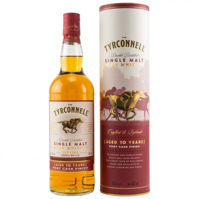 Tyrconnell 10 Years Port Cask Single Malt Irish Whiskey Rubrik: Irish Whiskey Ursprungsland: Irland Nettofüllmenge: 0,7 Liter Alkoholgehalt: 46% vol. Zusatzstoffe: enthält Farbstoff E150a (Zuckerkulör) Loskennzeichnung: ja Warnhinweise: Abgabe nicht an Jugendliche unter 18 Jahren Nicht für schwangere oder stillende Frauen empfohlen Name und Adresse des Herstellers / Importeurs: Andrew A. Watt & Co., Riverstown, County Louth Beam Deutschland GmbH, Unterschweinstiege 2-14, 60549 Frankfurt am Main Zutaten: Irish Whiskey  (aus gemälzter Gerste destilliert), Wasser, Farbstoff E150a Der TYRCONNELL Single Malt ist ein hochwertiger Whisky Der TYRCONNELL Single Malt mit der Bezeichnung Port Cask von Andrew A. Watt & Co. wird ausschließlich aus gemälzter Gerste destilliert. Nach 10-jähriger Lagerung erhält dieser irische Whiskey sein 6-monatiges Finish in ausgesuchten Portwein-Fässern, was ihm ein besonderes, nach Portwein, Malz, Zitrusfrüchten, Gewürzen und einem Hauch von Schokolade duftendes…